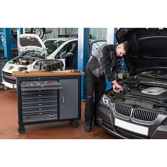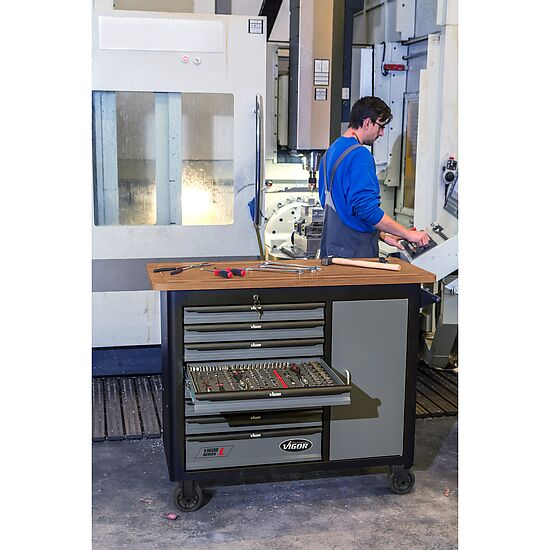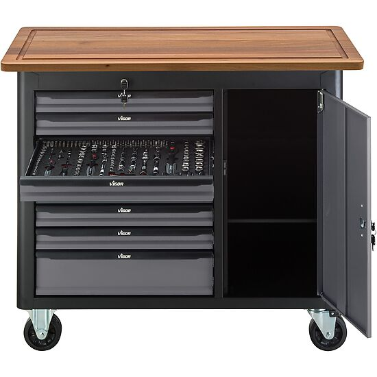 Bancada de trabalho móvel com sortimento e tampo de madeira