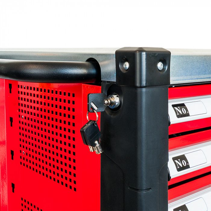 Equipado com 447 ferramentas e 16 amplas gavetas, o carro combina uma funcionalidade excepcional com uma construção robusta. Graças às guias de bolas reforçadas, ao fecho centralizado e às 4 rodas giratórias, sendo 2 delas com travão, garante conforto e segurança no seu trabalho.