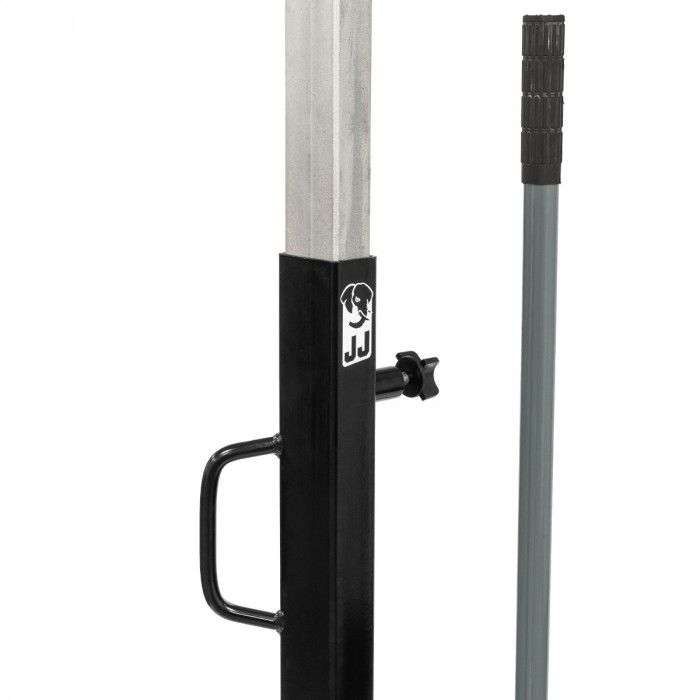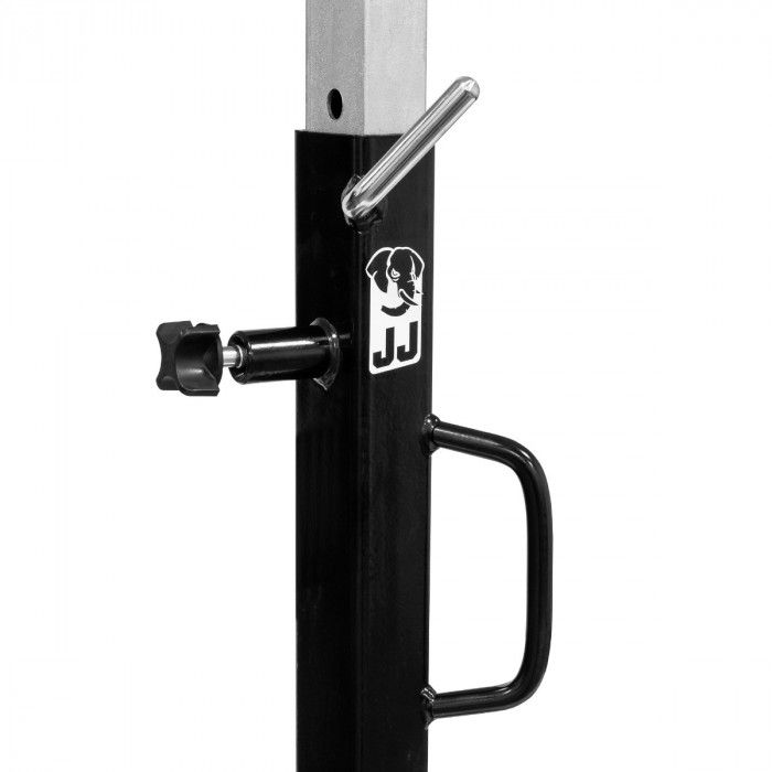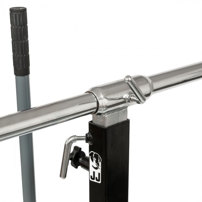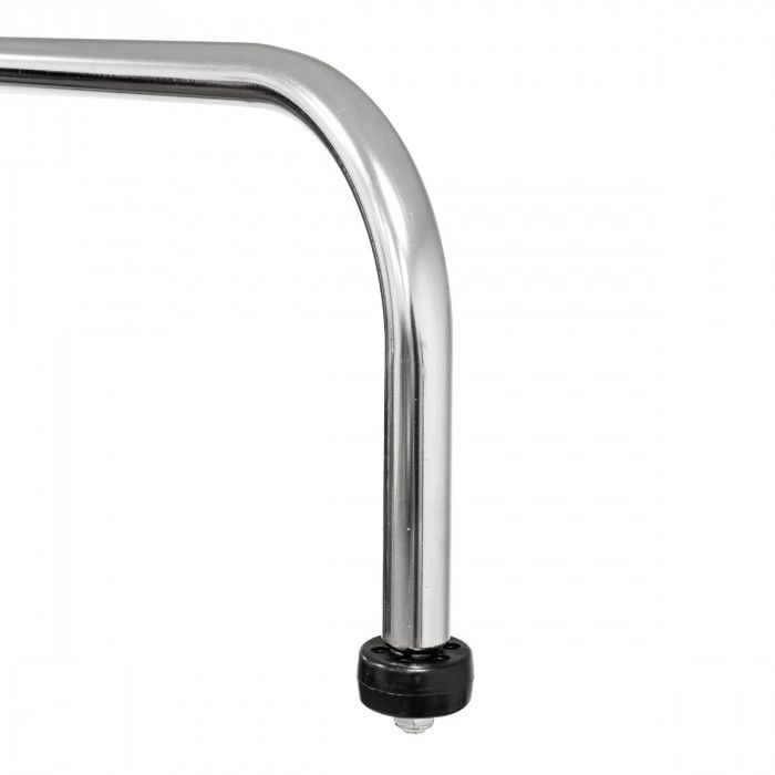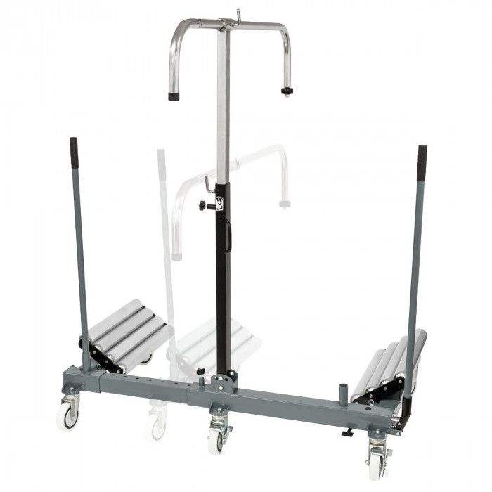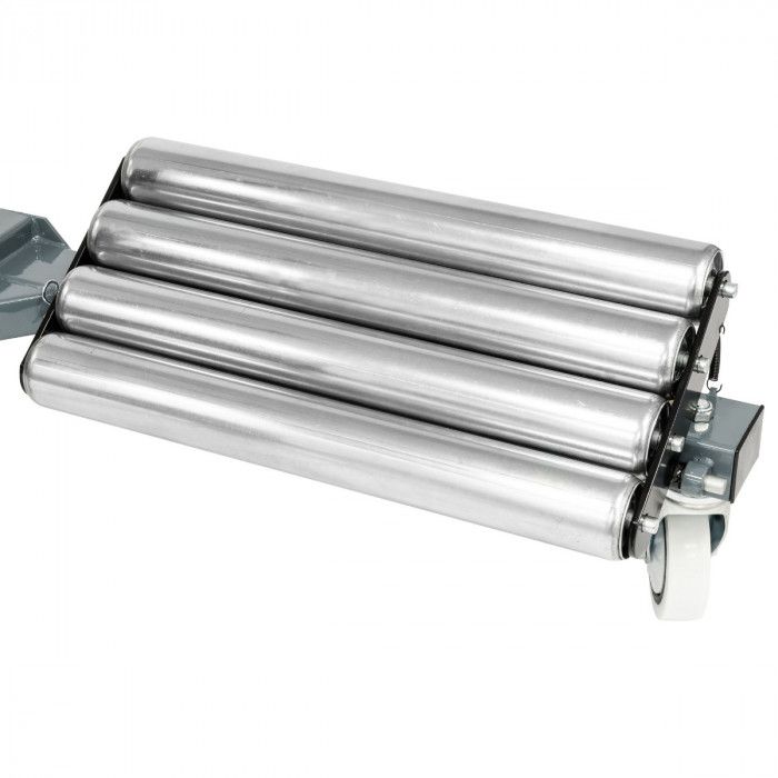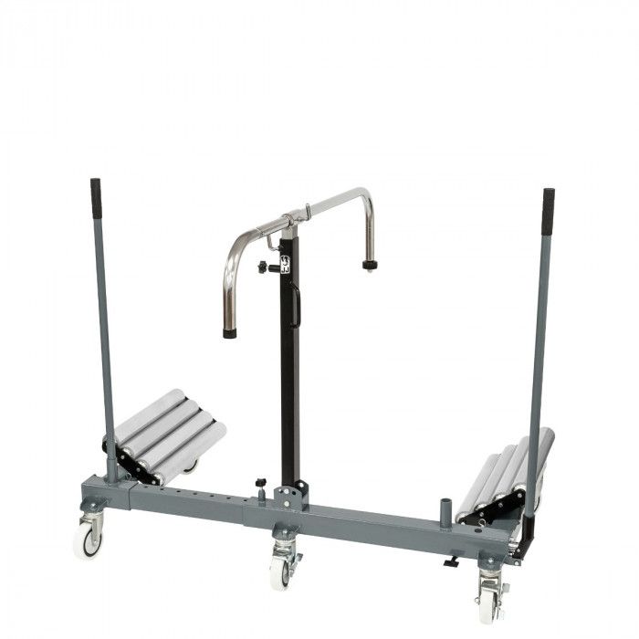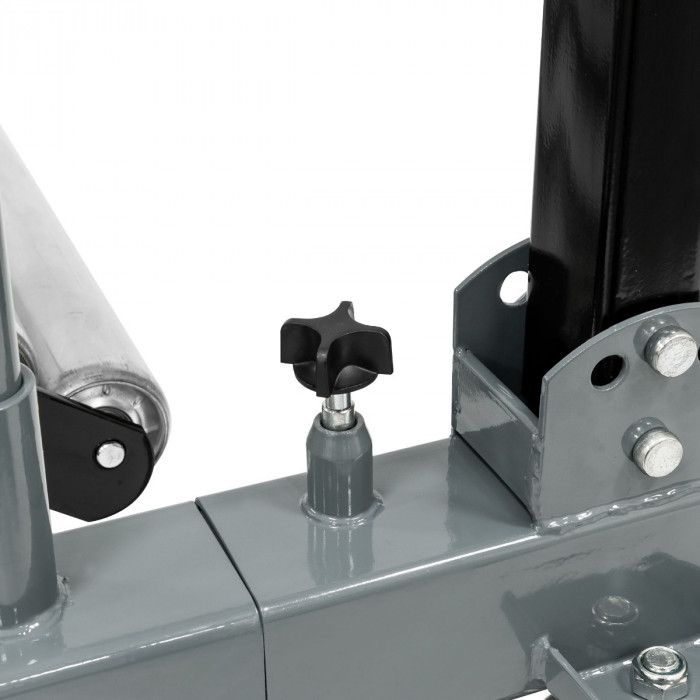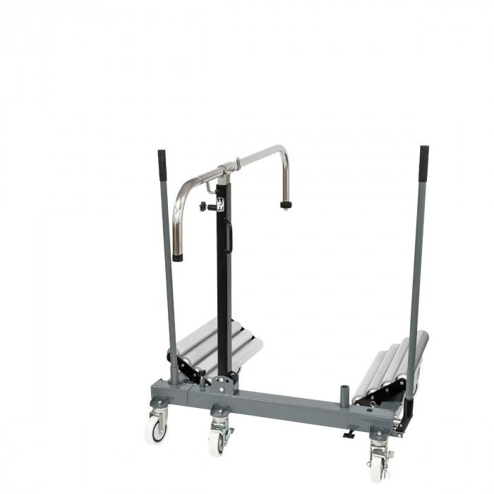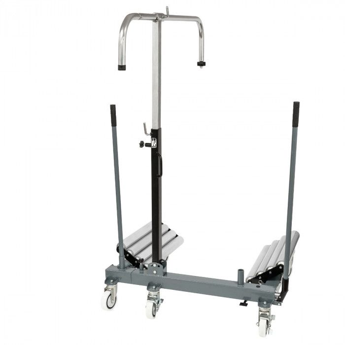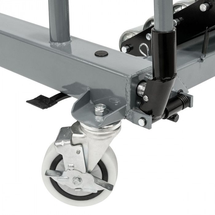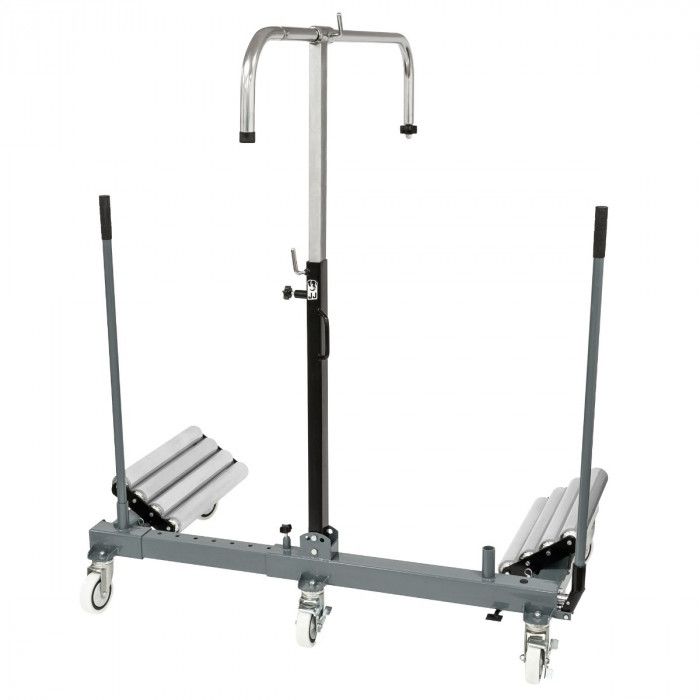 Estrutura robusta em aço, equipada com 5 rodas giratórias que garantem estabilidade e elevada manobrabilidade. Dispõe de roletes laterais inclinados para facilitar o posicionamento e centragem da roda, bem como de coluna central ajustável em altura com suporte superior em “U” para apoio seguro durante operações de montagem/desmontagem.