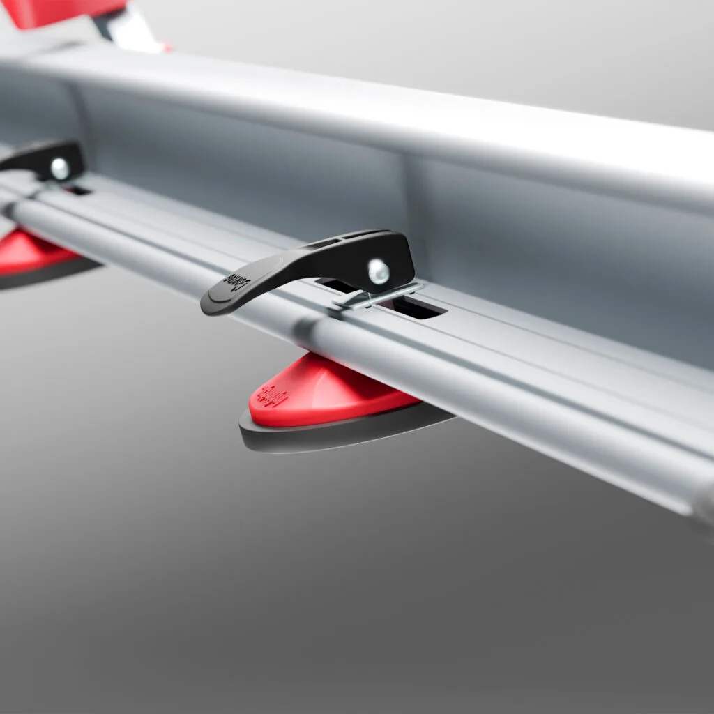 - Régua em alumínio leve com ventosas de 117 mm para fixação segura em diferentes superfícies.