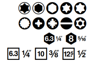 | Encaixe (Drive) | 1/4″ · 5/16″ · 3/8″ · 1/2″ |