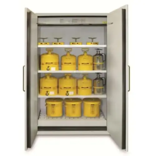 Armário de segurança ignífugo EF 14010 com resistência ao fogo de 90 min (EN 14470-1). Estrutura em aço eletrogalvanizado, portas duplas com fecho automático a 70 °C, 3 prateleiras reguláveis e cuba de retenção de 16 L. Preparado para ventilação e filtração com filtro de carvão ativo.
