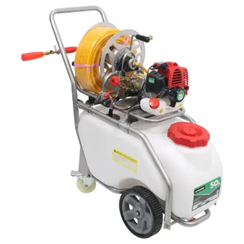 Atomizador potente e versátil com tanque de 50 litros, ideal para aplicações agrícolas e industriais. Equipado com motor a 2 tempos de 25.4cc, oferece uma pressão ajustável entre 15 e 25 bar, com um caudal de 8L/min, garantindo desempenho eficiente. Inclui acessórios como mangueira de 30 metros e pistola de aplicação. Estrutura robusta e fácil de utilizar, com potência de 0.7KW e construção leve com apenas 15 kg líquidos.