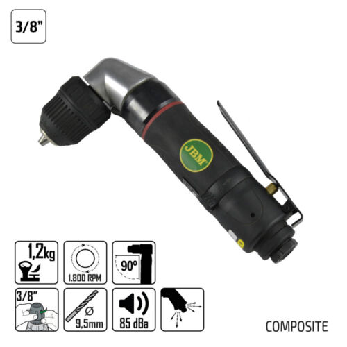 O Berbequim Angular 90º Composite JBM é uma ferramenta versátil e eficiente, ideal para trabalhos em locais de difícil acesso graças à sua cabeça angular de 90 graus. Possui acabamento em borracha para maior conforto e aderência durante a utilização. O seu sistema reversível em ambos os lados facilita o manuseamento e torna-o adequado para múltiplas aplicações. É compatível com mangueira, tem saída traseira e uma rotação de entrada de ar para melhor performance. Equipado com um nível de ruído reduzido, proporciona uma experiência de utilização mais confortável. A broca de Ø9,5mm permite uma perfuração precisa.