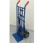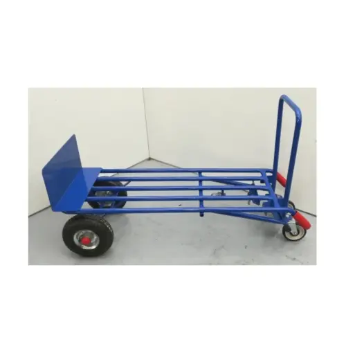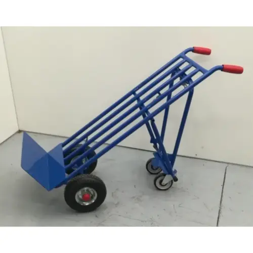 Dispõe de um sistema prático que permite transformar rapidamente o carro em três posições distintas: horizontal (plataforma), vertical e inclinada, adaptando-se a diferentes tipos de carga e operações. Está equipado com rodas dianteiras pneumáticas de Ø 260 mm, garantindo um bom desempenho em pisos irregulares, e rodas traseiras em borracha maciça para maior durabilidade.