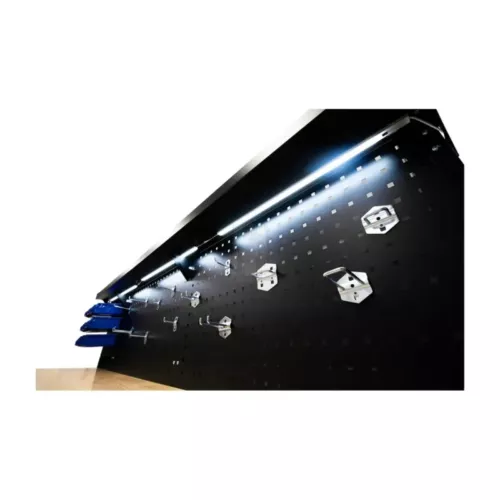 O painel proporciona iluminação integrada, ideal para ambientes de trabalho com pouca luz. Inclui tomadas elétricas para maior funcionalidade.