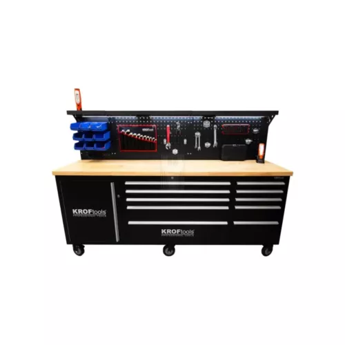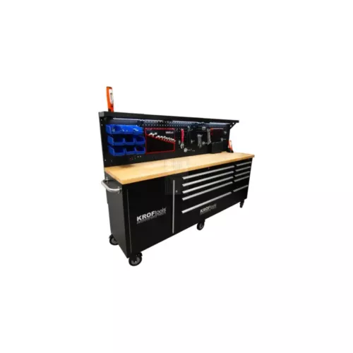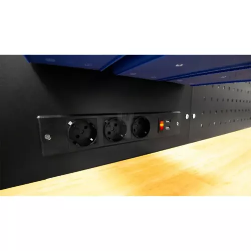 Carro de trabalho de 84” equipado com luz LED no painel e tomada elétrica. Possui tampo de madeira com 38 mm de espessura, duas pegas laterais para manuseamento, além de rodas resistentes – sendo quatro de 165 mm com travão e duas adicionais de 165 mm. Estrutura robusta com diferentes compartimentos de gavetas para organização eficiente.