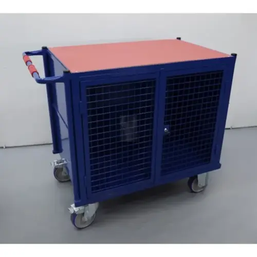 CARRO PORTA FERRAMENTAS MALHA construído em aço perfilado e tubo de aço, perfeito para utilizar-se em oficinas e em todos os lugares donde se realizam trabalhos de montagem, reparações, fabricação, etc. Portas com malha de 50×50 e aros para colocar cadeado. Superfície de fibra de madeira vermelha. 2 rodas giratórias com freio e 2 fixas.