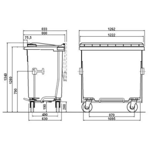 Contentor fabricado em polietileno de alta densidade, resistente aos raios ultravioleta e infravermelhos, ao decorrer do tempo e das altas e baixas temperaturas. De fácil lavagem com agua. Rodas de borracha maciças. Tampa com borda para um levantamento continuo sobre toda a parte frontal. 6 asas laterais e 2 pegas de agarre. Como opção pode-se colocar um pedal de abertura de tampa.