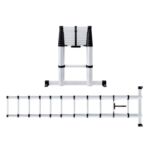 Escada telescópica em alumínio com capacidade de carga até 150 kg, ideal para múltiplas aplicações em ambientes domésticos, profissionais ou industriais. Apresenta estrutura robusta e compacta, com sistema de extensão e retração que permite fácil transporte e armazenamento. Certificada pela norma EN 131-4.