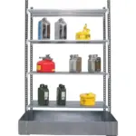 Estante de grande capacidade, equipada com uma cuba de retenção em aço galvanizado de 179 litros, concebida para armazenamento seguro de produtos e líquidos poluentes. Estrutura robusta, suporta uma carga total até 1000 kg.