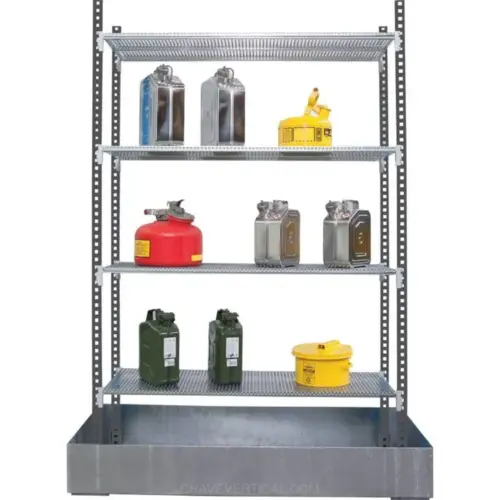 Inclui 4 prateleiras (1000 x 600 x 30 mm) revestidas com chapa galvanizada perfurada, com capacidade máxima de 250 kg por prateleira. O bac de retenção localizado na base da estante garante segurança adicional contra derrames.