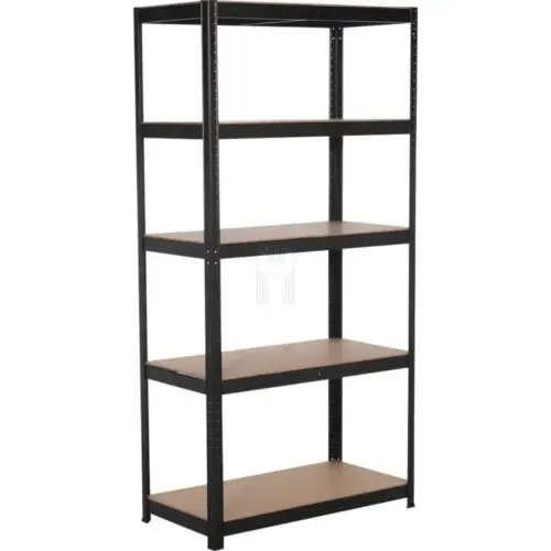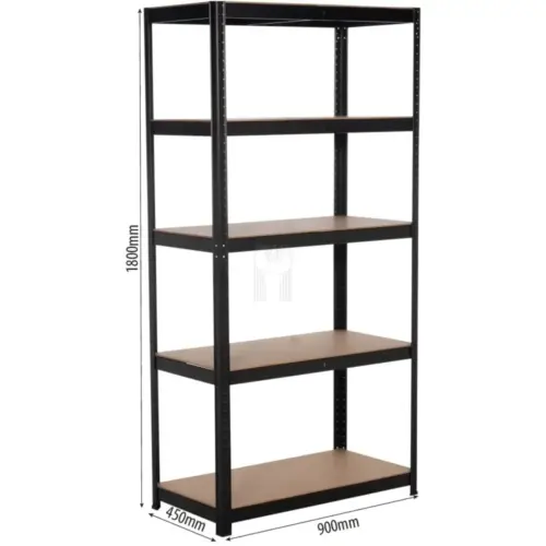 A estante metálica preta de encaixe com 5 prateleiras em madeira é ideal para organizar espaços de garagem, oficina ou armazém. Com estrutura em aço pintado a preto e prateleiras em MDF, oferece robustez e estabilidade, suportando até 1,25 toneladas no total. Não é recomendada para utilização em ambientes húmidos.