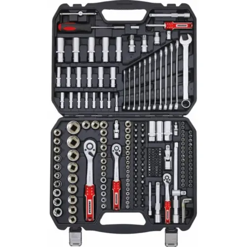 Jogo profissional com 219 peças para oficina e manutenção. Inclui chaves de caixa nos quadrados 1/4″, 3/8″ e 1/2″, extensões, cardans, bits e chaves mistas organizadas em estojo robusto. Aço cromo-vanádio para elevada resistência e cliquets de 72 dentes para maior precisão no aperto.