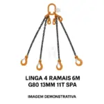 Linga de corrente em aço grau 80, com 4 ramais de 6 metros e diâmetro de 13 mm. Equipada com anilha tripla, ganchos de lingueta, ganchos encurtadores e malla de união. Inclui placa identificativa com capacidade de carga certificada.