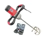 Misturadora elétrica portátil com 2 velocidades variáveis, concebida para mistura de gesso, cimento, argamassa, cola de cimento, betão e rebocos. Binário elevado para misturas consistentes. Fornecida com haste Ø140 mm (3 hélices), haste Ø160 mm (2 hélices), dois prolongadores (85 mm e 185 mm), chaves de montagem e mala.