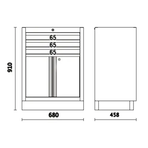 O C45PRO 2.0 M3A é um módulo fixo com 3 gavetas e duas portas, concebido para integrar o sistema de mobiliário de oficina C45PRO 2.0 da BETA. As gavetas possuem guias com rolamentos de esferas e fundo protegido com tapete de borracha.