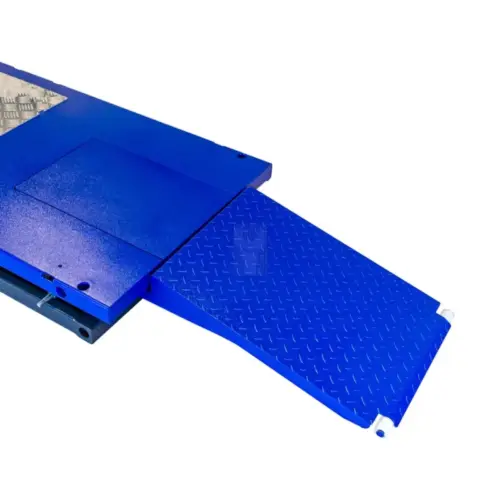O equipamento está equipado com unidade elétrica integrada, comando magnético de fácil utilização e placas dianteiras e traseiras dobráveis que facilitam o acesso às rodas. O bloqueio mecânico automático impede descidas involuntárias da mesa, assegurando máxima proteção. Além disso, é expansível com extensões de largura e comprimento para maior versatilidade.
