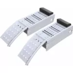 Rampas metálicas dobráveis em três partes, fabricadas em aço resistente, ideais para carga e elevação de equipamentos com pneus. Suportam até 500 kg por par quando desdobradas, e até 1600 kg quando dobradas. Compatíveis com a maioria dos veículos, mas não são adequadas para máquinas com lagartas.