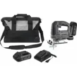 Conjunto composto por 2 baterias Li-ion 20 V 2 Ah, carregador 3 A e saco têxtil. Traz ainda chave Allen, guia paralelo, adaptador de poeiras e uma lâmina para madeira.