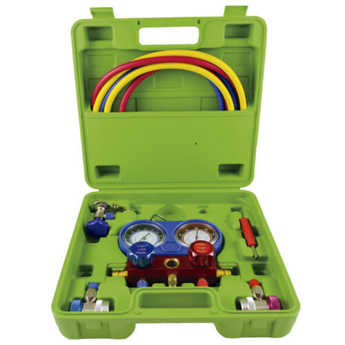 SET VERIFICAÇÃO ENCHIMENTO ESVAZIAMENTO A C JBM é um conjunto profissional desenvolvido para teste de variações dos sistemas de alta e baixa pressão de ar condicionado automóvel. Fabricado em blocos de alumínio leve com visor de vidro, este kit inclui acopladores de serviços profissionais codificados por cores, três mangueiras de carregamento com 1550mm e um gancho de suspensão para utilização prática e mãos-livres. Compatível com gases R134a e R12, garante precisão, segurança e durabilidade no processo de enchimento, verificação e esvaziamento do sistema A/C do veículo.