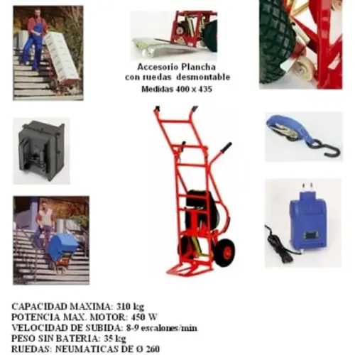 Sobe Escadas eléctrico perfeito para o transporte e elevação por escadas de cargas até 310 Kg. 1 Pessoa pode manusear e transportar facilmente a carga sem nenhum problema. Eleva cargas com movimentos suaves devido as rodas pneumáticas. A elevação é controlada electricamente através dum interruptor. A bateria está incluída e a sua troca é rápido e simples. Possibilidade de colocar um acessório com rodas para aumentar a área da pá e poder suportar cargas mais volumosas. Marcado CE.