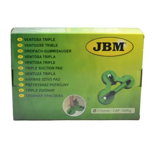 A Ventosa Tripla Ø115mm 100kg JBM é uma ferramenta prática e segura para a elevação, fixação e transporte de superfícies lisas, como vidro, chapa metálica, placas de plástico ou painéis decorativos.